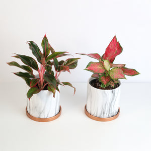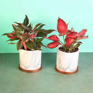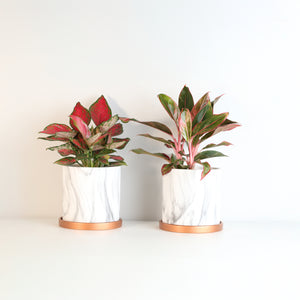 Option 2: Two Aglaonemas in our luxurious Selene Planters—a ceramic marble finish with rose gold tray, complete with drainage and chic sophistication.