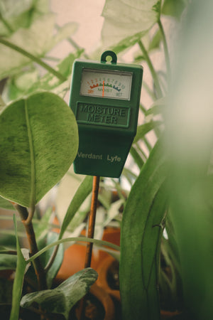 This meter, aka hygrometer, is straightforward and just measures moisture levels at the depth of the tip and gives you a reading. Most plants like to stay in the green area, while certain plants actually live to veer into the red or blue zones.