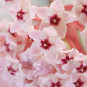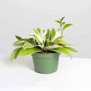 The Hoya carnosa Krimson Queen is a favorite in our pink plant assortment. This is a semi-succulent, perennial, that trails and vines with lush waxy foliage and gorgeous blooms. Needs bright light and drying between watering but will give you amazing growth in hanging pots or elevated shelves. A perfect plant for novice houseplant owners. The Krimson Queen is very similar to the Krimson Princess but with the edges around the outside being white, sometimes known as reverse variegation.