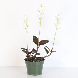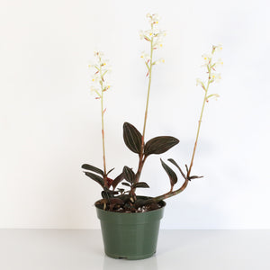 This is an easy indoor plant to care for. A mature Jewel Orchid that is several years old and has received good care will eventually produce multiple growths and spread out. When it's time for the plant to flower, the growths will each produce a flowering spike that grows upwards quickly. Once ready the flower buds will open and show off many little white flowers which certainly create a lasting impression. Keep the plant away from any harsh sunlight that filters through during the day. Comes in a 4” nursery pot. It can handle low light. Water the plant well and then wait until it's drying out before watering again.