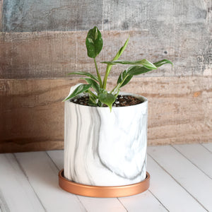 - Athena Planter - Marble planter with drainage hole and matching rose gold ceramic tray. The planter measures: 5.5" x 5.5" x 6" and weighs approximately 1.2 lbs. We recommend placing your plant in the nursery pot inside it to make it easy to water and transplant.