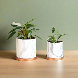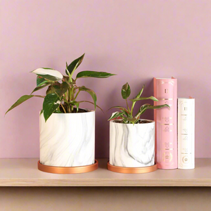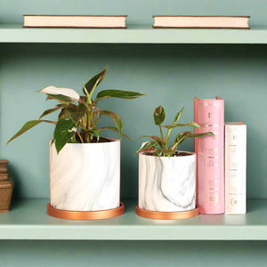 - Selene Planter - Ceramic 6.5" marble planter with drainage hole and matching rose gold ceramic tray. The planter measures: 7.5" x 6.5" x 6.5" and weighs approximately 3.7 lbs. We recommend placing your plant inside the nursery pot to make it easy to water and transplant.