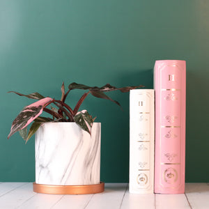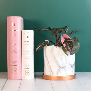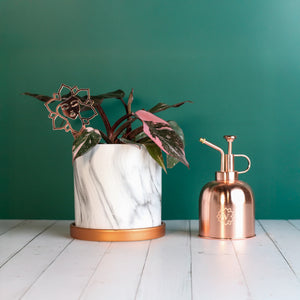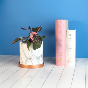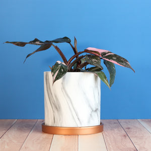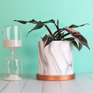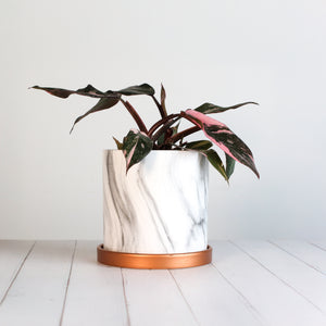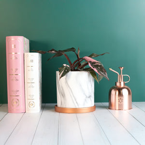 • Selene Planter - Ceramic 6.5" marble planter with drainage hole and matching rose gold ceramic tray. The planter measures: 7.5" x 6.5" x 6.5" and weighs approximately 3.7 lbs. We recommend placing your plant inside the nursery pot to make it easy to water and transplant.