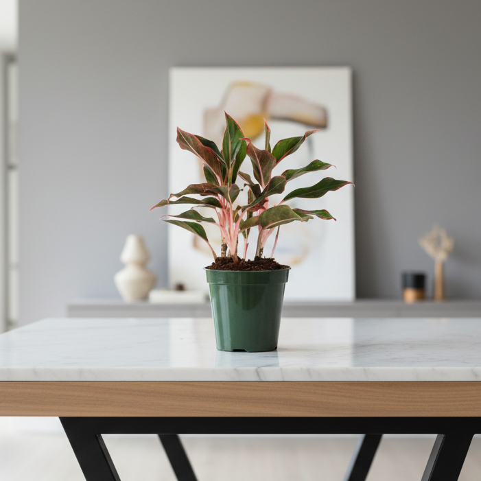 Aglaonema ‘Siam’ – also known as Chinese Evergreen ‘Siam’ – is a vibrant tropical houseplant that brings bold color and effortless beauty to any indoor space. With its stunning red-pink stems and deep green, lance-shaped leaves edged in crimson, this low-maintenance stunner is perfect for brightening up your home or workspace. Additionally, they are known for being air-purifying plants, contributing to a healthier indoor environment.