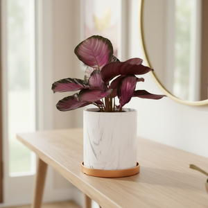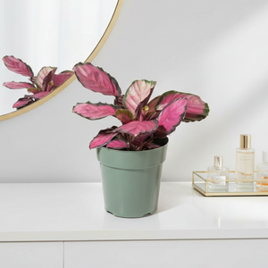 New leaves start light pink with a green tint and deepen as they mature. If this plant doesn't get sufficient humidity, its edges will start to brown a bit; although it will be perfectly healthy, that damage is irreversible. Regular misting helps keep that issue at bay. Calathea's are one of our most loved plants; they are known as the Prayer Plants and are a bit temperamental, needing the right mixture of humidity and indirect lighting