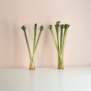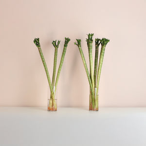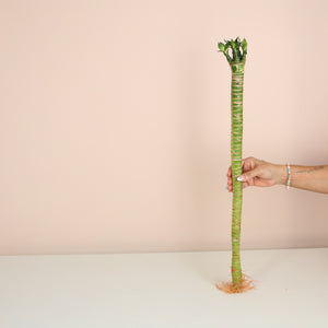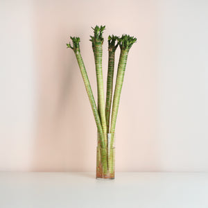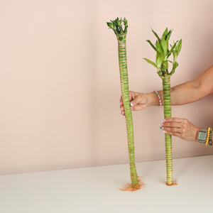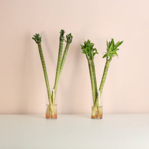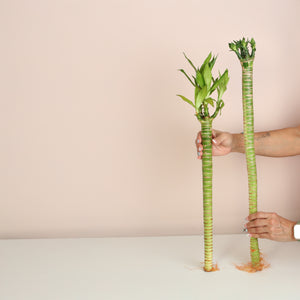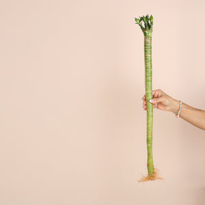 Lotus Bamboo grows happily in water with minimal effort. Just submerge the roots in fresh water, keep in indirect sunlight, and change the water monthly. Let tap water sit overnight to let chlorine evaporate for happier plants. You can also add pebbles or rocks for stability and extra style.