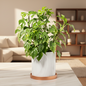- Selene Planter - Ceramic 6.5" Marble Planter with drainage hole and matching rose gold ceramic tray. The planter measures: 7.5" x 6.5" x 6.5" and weighs approximately 3.7 lbs. We recommend placing your plant in the nursery pot inside it to make it easy to water and transplant.
