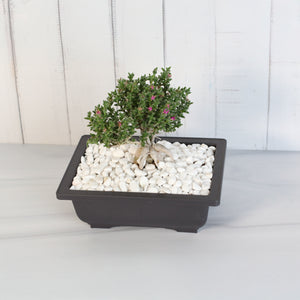 Its textured, thickened trunk develops naturally over time, giving it an aged, rugged aesthetic, while the small, spiky green leaves resemble tiny pine needles. With proper care, it may even reward you with vibrant daisy-like purple blooms in the spring or summer.