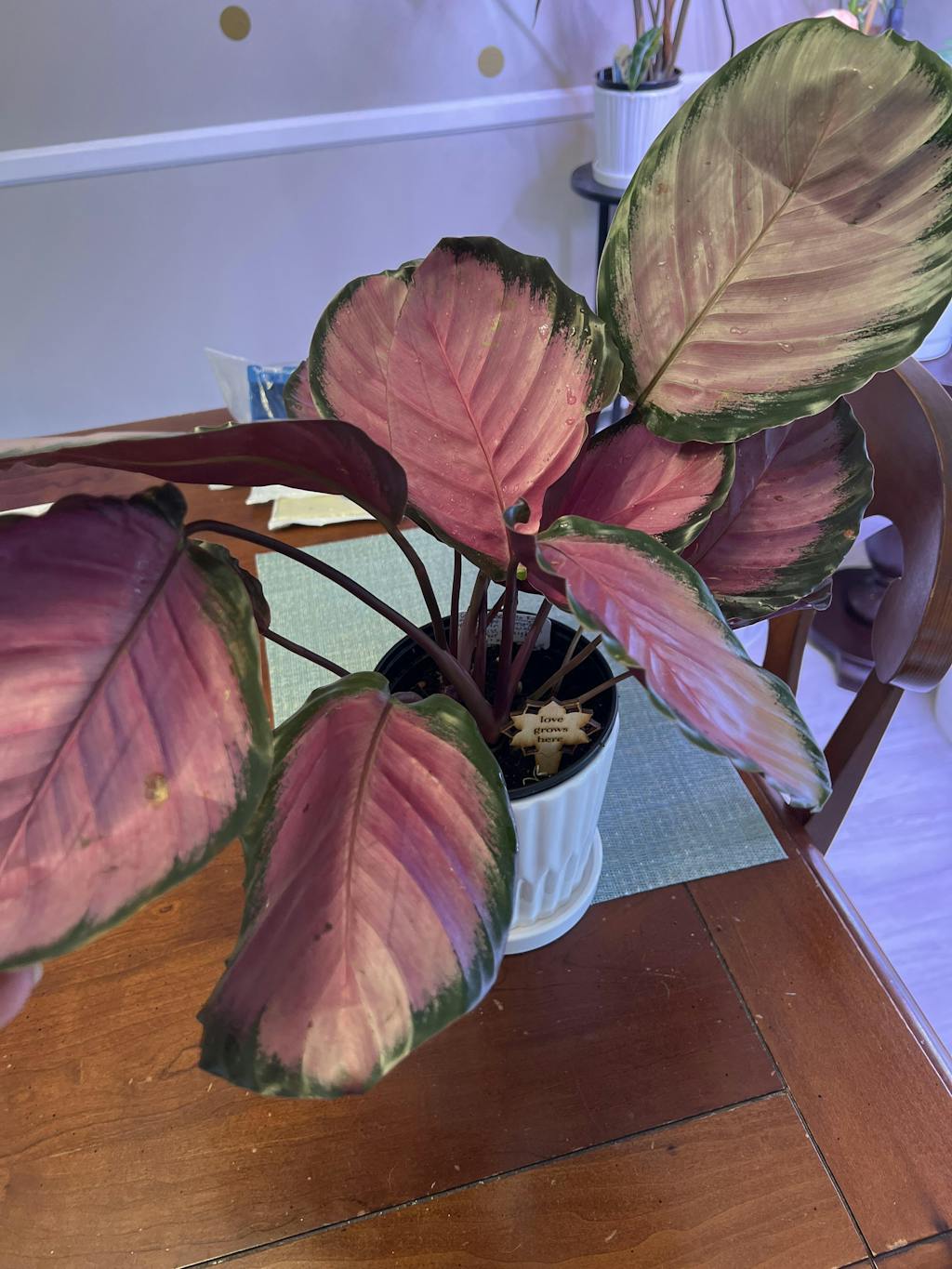 New leaves start light pink with a green tint and deepen as they mature. If this plant doesn't get sufficient humidity, its edges will start to brown a bit; although it will be perfectly healthy, that damage is irreversible. Regular misting helps keep that issue at bay. Calathea's are one of our most loved plants; they are known as the Prayer Plants and are a bit temperamental, needing the right mixture of humidity and indirect lighting