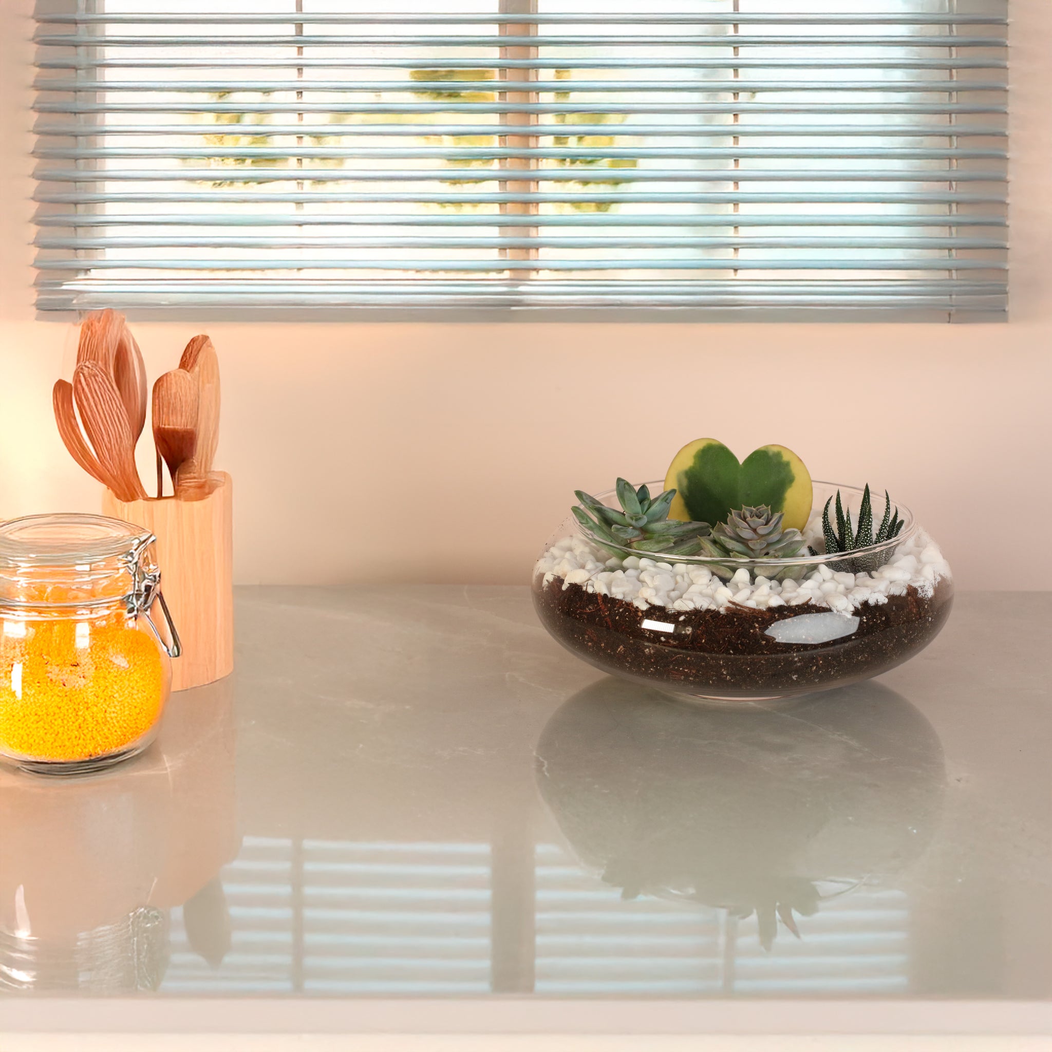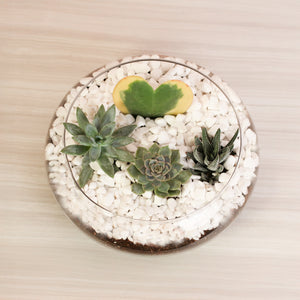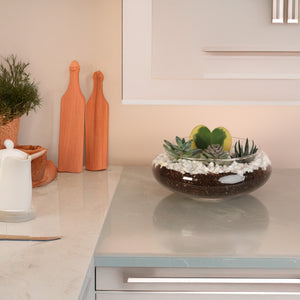 Each kit includes one 4" Hoya Kerrii Variegated Heart, three 2" mystery succulents, a glass terrarium, a bag of soil and rocks - White Diamonds creating a delightful mix of textures and surprises. Thoughtfully curated to make plant styling easy and joyful, this greenhouse-inspired terrarium brings warmth and whimsy to any space. With included soil, decorative elements, and simple instructions, you’ll enjoy a hands-on experience that’s both calming and creative.