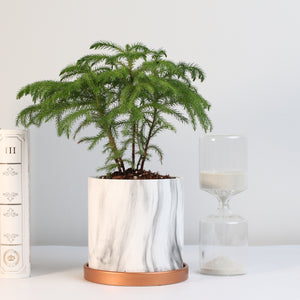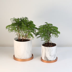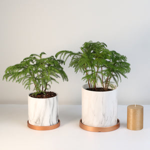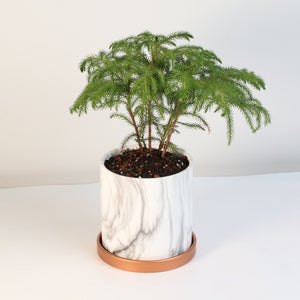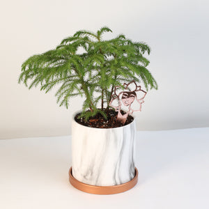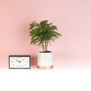 • Selene - This plant comes packaged in a white 6-inch round marbled porcelain planter pot ready for your home or office space with a ceramic rose gold tray to catch drips when watered.