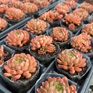 The 'Pink Ruby' Succulent features tightly clustered rosettes with dusty pink and pale blue-green leaves that have a delicate powdery coating. Its foliage coloration will intensify under bright sunlight, becoming a rich, deep pink shade and look almost red. Additionally, this succulent produces small, star-shaped flowers that bloom in early summer, which further adds to its charm.